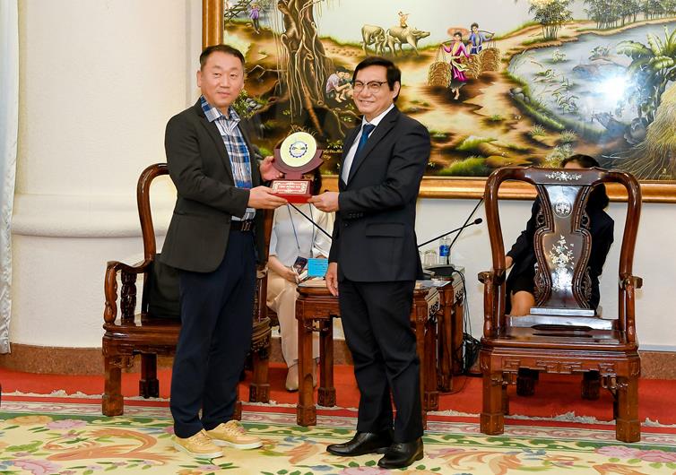 Phó Chủ tịch UBND tỉnh Nguyễn Sơn Hùng tặng quà lưu niệm cho ông Shin DongHyon - Trưởng đoàn