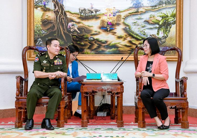 Phó Chủ tịch UBND tỉnh Nguyễn Thị Hoàng trao đổi cùng Trung tướng Yong Mao, Phó Tổng Cục trưởng Tổng Cục Dịch vụ quốc phòng, Quân đội Hoàng gia Campuchia tại buổi tiếp