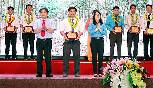 Chủ tịch Công đoàn Cao su Việt Nam Phan Mạnh Hùng và Chủ tịch LĐLĐ tỉnh Nguyễn Thị Như Ý trao biểu trưng cho “Công nhân cao su Đồng Nai ưu tú”.