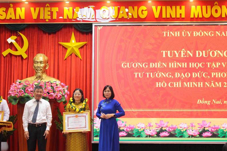 Phó Bí thư Thường trực Tỉnh ủy Hồ Thanh Sơn và Phó Chủ tịch UBND tỉnh Nguyễn Thị Hoàng trao khen thưởng cho các tập thể, cá nhân đạt thành tích xuất sắc trong học tập và làm theo Bác