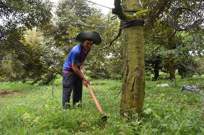 Anh Nguyễn Hoàng Lâm (tổ 8, ấp Đồi Rìu, xã Hàng Gòn, TP.Long Khánh) đang chăm sóc vườn sầu riêng tươi tốt của gia đình