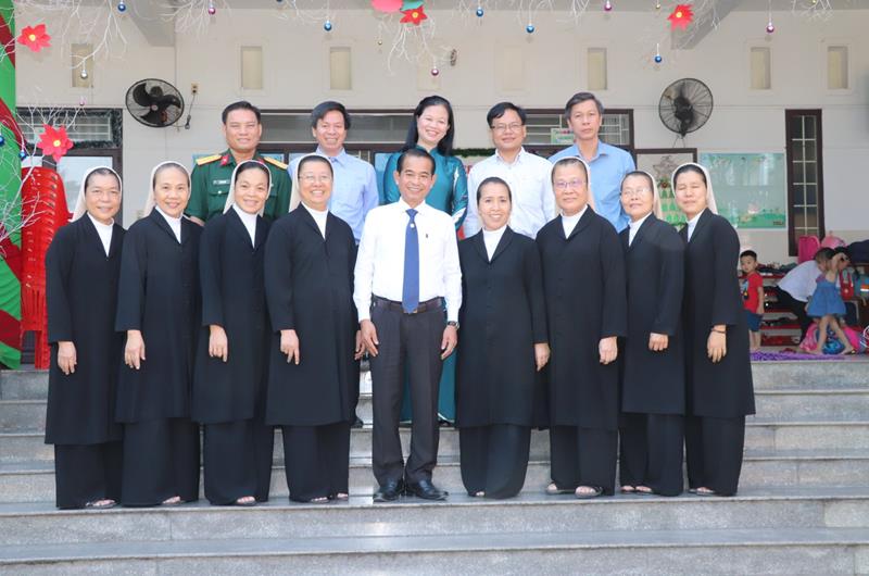 Chủ tịch HĐND tỉnh Thái Bảo cùng đại diện các ban, ngành trong tỉnh chụp hình lưu niệm cùng các nữ tu của Dòng Nữ tỳ Chúa Giêsu Linh mục
