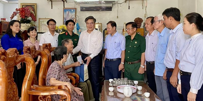 Bí thư Huyện ủy Long Thành Dương Minh Dũng và đoàn công tác của Tỉnh ủy, HĐND, UBND, Ủy ban MTTQ Việt Nam tỉnh tặng quà chiến sĩ Điện Biên Nguyễn Văn Toán, 88 tuổi, ấp Hàng Gòn, xã Lộc An.