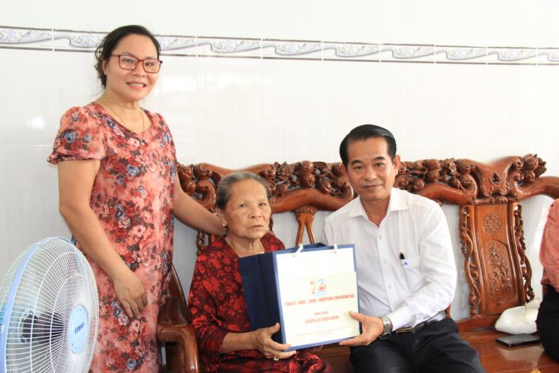 Trong đó, đoàn đã đến thăm, tặng quà cụ Trần Thị Hoa (sinh năm 1934) và cụ Đậu Thị Phương (sinh năm 1930), đều ở ấp Bến Cam, xã Phước Thiền (huyện Nhơn Trạch); cụ Phan Văn Kiệt (sinh năm 1925), ở khu phố Long Điềm, phường Long Bình Tân (thành phố Biên Hòa).