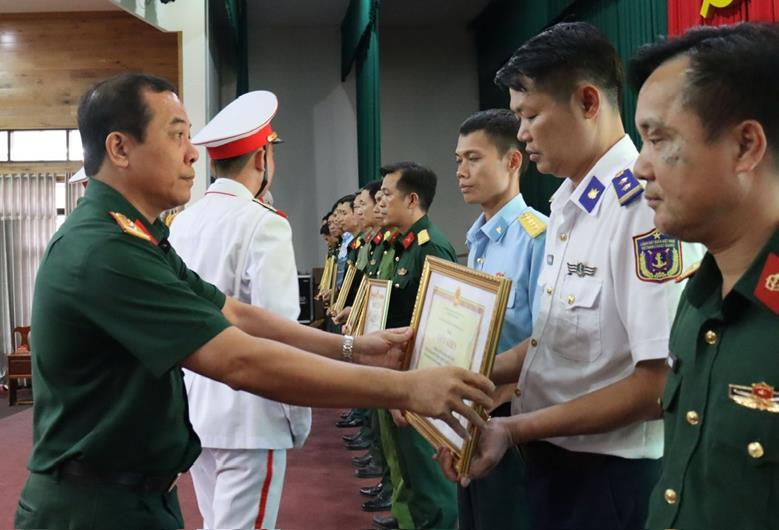 Đại tá Vũ Văn Điền, Chỉ huy trưởng Bộ Chỉ huy quân sự tỉnh khen thưởng lực lượng sĩ quan các đơn vị phối hợp hiệu quả trong đóng quân canh phòng