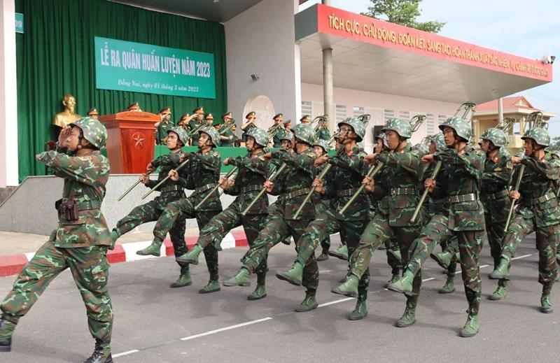 Sĩ quan trẻ chuyên ngành đặc thù diễu hành trong lễ ra quân huấn luyện năm 2023