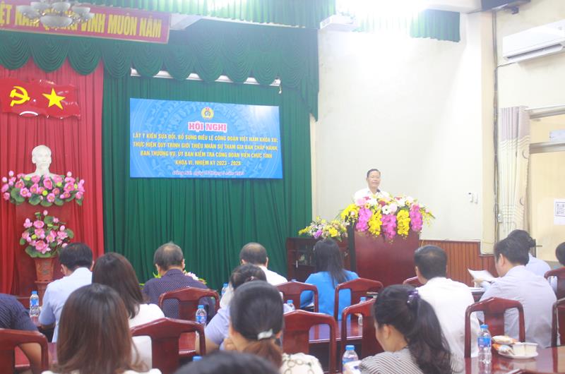 Hội nghị tập trung lấy ý kiến sửa đổi, bổ sung Điều lệ Công đoàn Việt Nam khóa XII. Thông qua hình sức góp ý trực tiếp và bằng văn bản, CĐVC tỉnh sẽ tổng hợp đến cuối tháng 5-2023 và báo cáo Công đoàn cấp trên để hoàn thiện dự thảo điều lệ Công đoàn Việt Nam.