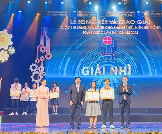Học sinh Tạ Quang Vĩ và Nguyễn Hoàng Thiên Ân nhận giải nhì cuộc thi Sáng tạo thanh, thiếu niên – nhi đồng toàn quốc