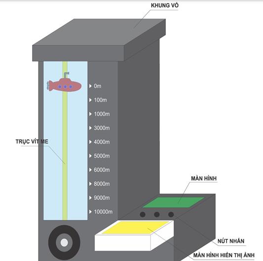 Theo đó, bộ thiết bị trò chơi Thiết bị “Thư viện sinh vật biển theo độ sâu mực nước” được thiết kế khá đơn giản, gồm các phần chính: màn hình hiển thị câu hỏi; các nút bấm A,B,C để điều khiển trò chơi, lựa chọn đáp án; màn hình hiển thị hình ảnh sinh vật biển; khung độ sâu mực nước biển có hệ thống đèn led và mô hình tàu ngầm có thể di chuyển theo độ sâu mực nước tùy theo lựa chọn của người chơi.