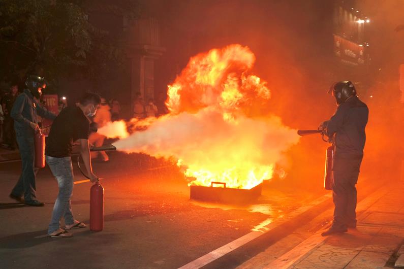 Người dân trong Tổ liên gia an toàn phòng cháy, chữa cháy ở P.Tân Tiến (TP.Biên Hòa) dùng bình chữa cháy dập tắt đám cháy giả định