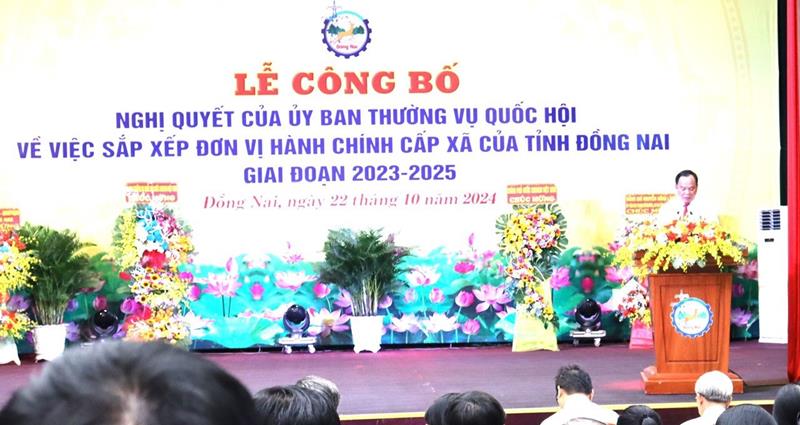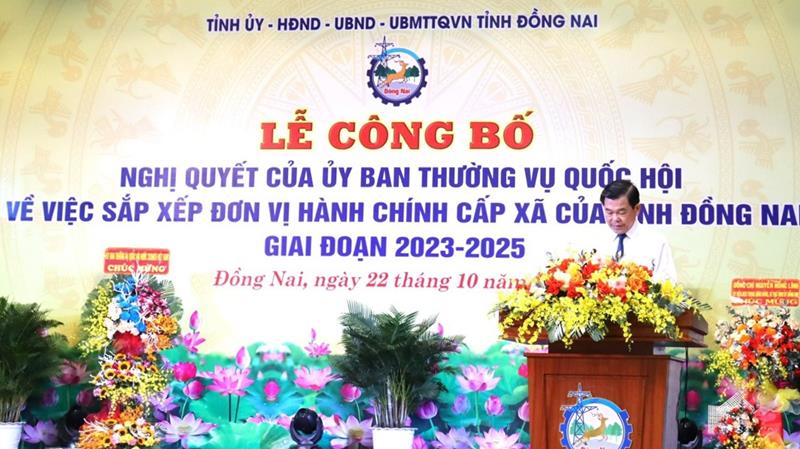 Tại buổi lễ, Phó Chủ tịch UBND tỉnh Võ Văn Phi đã giới thiệu toàn văn Nghị quyết 1194 của Ủy ban Thường vụ Quốc hội về việc sắp xếp ĐVHC cấp xã của tỉnh giai đoạn 2023-2025. Nghị quyết có hiệu lực từ 1-11-2024; tỉnh Đồng Nai sau sắp xếp sẽ còn 159 ĐVHC cấp xã thay vì 170 hiện nay.