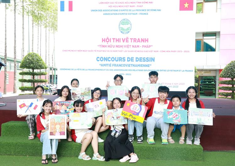 Học sinh hào hứng trước giờ tham gia hội thi vẽ tranh, chủ đề: “Tình hữu nghị Việt Nam - Pháp” nhằm chào mừng kỷ niệm Ngày Quốc tế Pháp ngữ, 50 năm Ngày thiết lập quan hệ ngoại giao Việt Nam – Pháp (1973-2023), do Đồng Nai tổ chức.