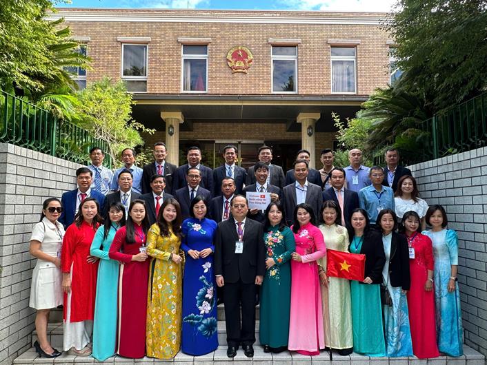 Đoàn công tác tỉnh và đại diện một số doanh nghiệp chụp hình tại trụ sở Đại sứ quán Việt Nam tại Tokyo Nhật Bản.