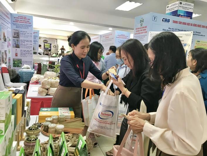 Chị Lê Thị Cẩm Vân (giữa) cùng sản phẩm nhang sạch thảo mộc tại ngày hội khởi nghiệp đổi mới sáng tạo tỉnh Đồng Nai năm 2023