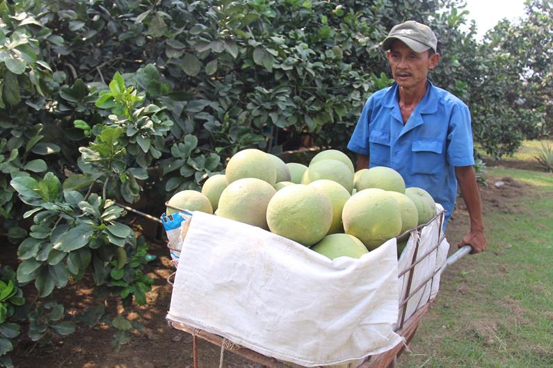 Nông dân thu hoạch bưởi tại xã Tân Bình (H.Vĩnh Cửu)