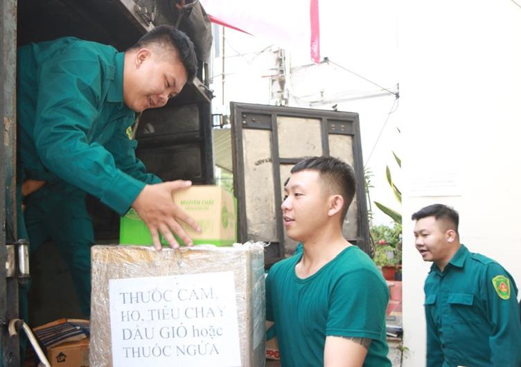 Thanh niên Đồng Nai khuân vác hàng hóa lên xe để chuyển đến hỗ trợ người dân miền Bắc bị ảnh hưởng bởi bão lũ