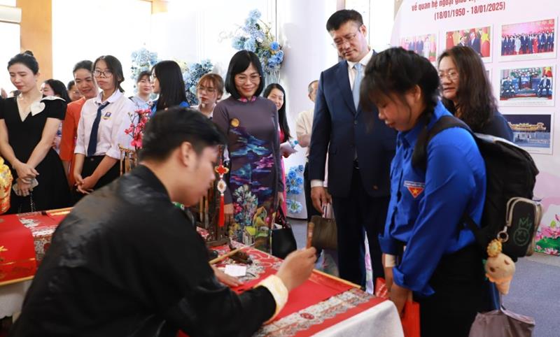 Phó Chủ tịch UBND tỉnh Nguyễn Thị Hoàng và Tổng Lãnh sự Trung Quốc tại Thành phố Hồ Chí Minh Ngụy Hoa Tường tham quan viết thư pháp tại lễ kỷ niệm