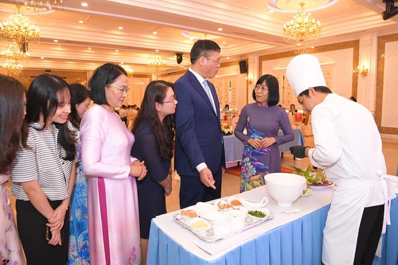 Phó Chủ tịch UBND tỉnh Nguyễn Thị Hoàng và Tổng Lãnh sự Trung Quốc tại Thành phố Hồ Chí Minh Ngụy Hoa Tường xem giới thiệu ẩm thực Đồng Nai tại lễ kỷ niệm