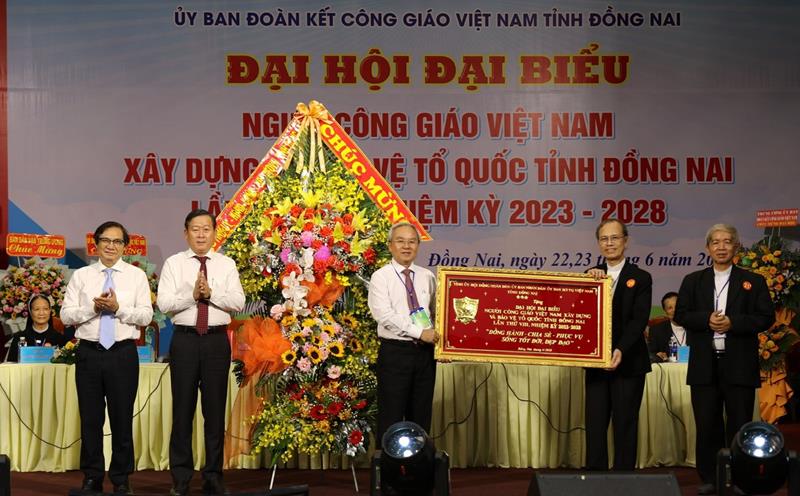 Đại diện Ủy ban Đoàn kết công giáo Việt Nam tỉnh nhận hoa và khánh mừng đại hội của Tỉnh ủy - HĐND - UBND - Ủy ban MTTQ Việt Nam tỉnh tại Đại hội đại biểu Người Công giáo Việt Nam xây dựng và bảo vệ Tổ quốc Việt Nam tỉnh Đồng Nai lần thứ VIII, nhiệm kỳ 2023-2028, diễn ra vào tháng 6-2023
