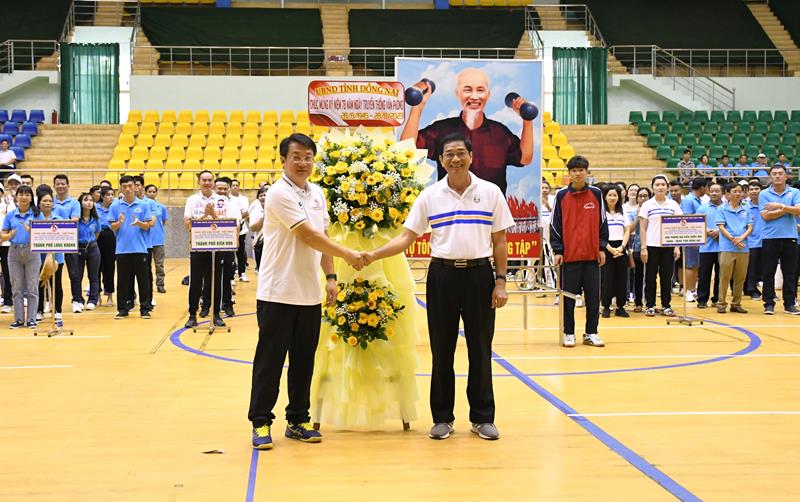 Phó Chủ tịch UBND tỉnh Võ Văn Phi tặng lẵng hoa của UBND tỉnh cho ban tổ chức