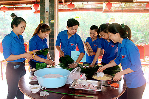 Chi đoàn Trung tâm Văn miếu Trấn Biên gói bánh chưng nhân ngày giỗ Tổ năm 2018.