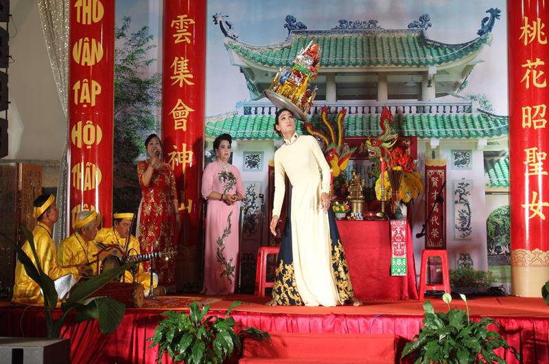 Nghệ nhân múa bóng rỗi của Đồng Nai thực hiện tiết mục dâng mâm vàng