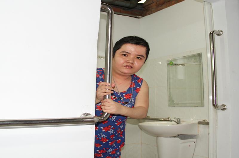 Bà Phùng Khanh Chúc, mẹ chị Hồng Tâm cho biết thêm: “Trước đây phải có người ở nhà để giúp Hồng Tâm ra vào nhà vệ sinh. Nay thì em nó có thể tự di chuyển đến nơi mình cần thông qua việc dùng sức đôi tay bám vào hệ thống tay vịn. Thêm vào đó, nhà vệ sinh được cải tạo lại với việc hạ chiều cao bồn cầu, hệ thống ống nước vừa tầm tay, tay vịn được lắp ở nhiều vị trí khác nhau nên Hồng Tâm có thể làm gần như mọi việc một mình mà không cần tôi phải kèm như trước”.