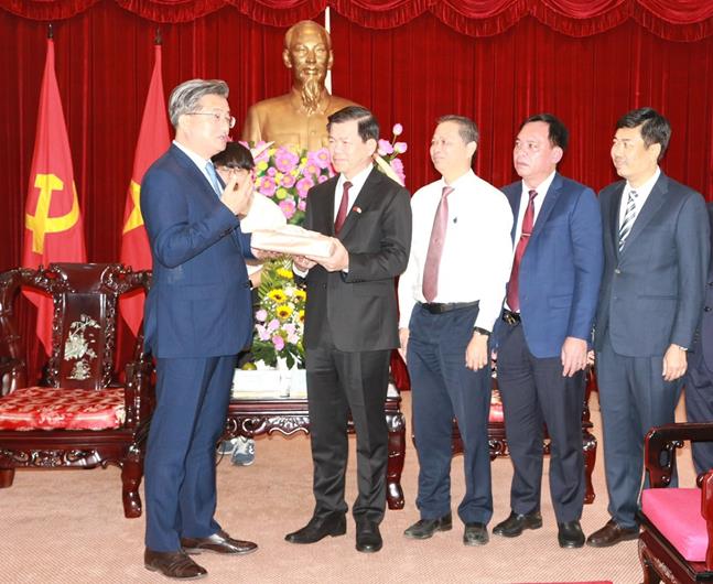 Ông Chung Yong Rae, Thị trưởng Quận Yuseong (TP.Daejeon, Hàn Quốc, bên trái) trao đổi cùng Ủy viên Trung ương Đảng, Bí thư Tỉnh ủy Nguyễn Hồng Lĩnh trong chuyến thăm và làm việc của đoàn Quận Yuseong tại Đồng Nai