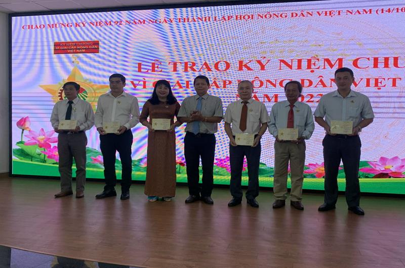 Ông Phạm Minh Hùng, Trưởng cơ quan thường trực Hội Nông dân Việt Nam khu vực phía Nam trao kỷ niệm chương "Vì giai cấp nông dân Việt Nam" cho lãnh đạo các cơ quan, ban, ngành tỉnh. Ảnh: Phan Anh