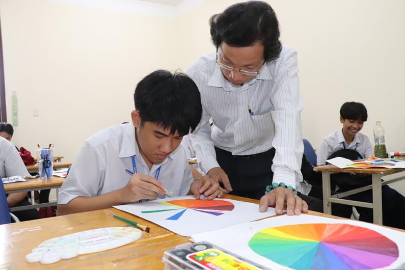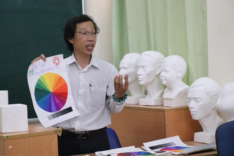 Họa sĩ Nguyễn Quốc Trọng trong giờ dạy học cho sinh viên Trường Cao đẳng Công nghệ và quản trị Sonadezi
