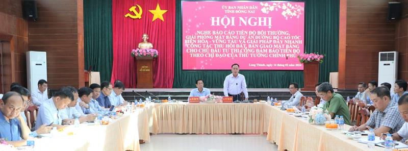 (CTT-Đồng Nai) Ngày 16-2, Quyền Chủ tịch UBND tỉnh Võ Tấn Đức đã chủ trì buổi làm việc với các đơn vị liên quan để nghe báo cáo tiến độ công tác bồi thường, giải phóng mặt bằng dự án đường bộ cao tốc Biên Hòa - Vũng Tàu và giải pháp đẩy nhanh công tác thu hồi đất, bàn giao mặt bằng cho chủ đầu tư thi công đảm bảo tiến độ theo chỉ đạo của Thủ tướng Chính phủ. Cùng tham dự buổi làm việc có Phó Chủ tịch UBND tỉnh Võ Văn Phi.