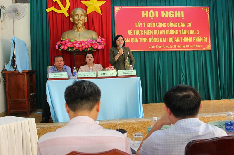 Chia sẻ tại hội nghị, Phó Chủ tịch UBND tỉnh Nguyễn Thị Hoàng cho rằng, dự án đường Vành đai 3 là công trình trọng điểm Quốc gia đã được Chính phủ, Quốc hội thông qua. Dự án thành phần 3 qua Đồng Nai dự kiến khởi công tháng 6-2023, trước thời điểm đó phải giải phóng mặt bằng ít nhất 70% khối lượng do đó cần sự đồng thuận cao của người dân. Lãnh đạo tỉnh đề nghị, huyện đẩy nhanh tiến độ dự án tái định cư tại xã Vĩnh Thanh để bố trí chỗ ở cho các hộ muốn tái định cư tại chỗ.