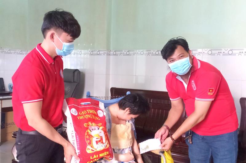 Anh Lê Quang Minh (bên phải) (ngụ xã Phước An, H.Nhơn Trạch) đang tặng quà cho người dân có hoàn cảnh khó khăn