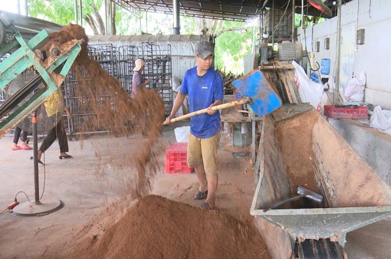 Người lao động đang làm việc tại cơ sở nấm mối đen của bà Hoàng Thị Thanh Nga