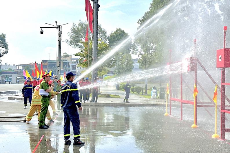 Dịp này, lực lượng chức năng cũng tổ chức diễn tập chữa cháy và cứu nạn, cứu hộ tại Trung tâm Hội nghị và Tổ chức sự kiện tỉnh (P.Tân Phong, TP.Biên Hòa).