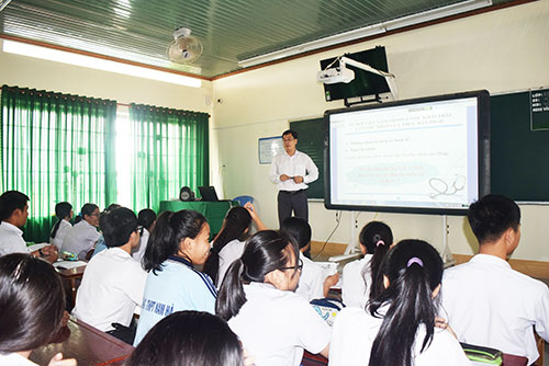 Ðược biết, Sở GD-ÐT yêu cầu hội giảng năm nay phải đáp ứng yêu cầu đổi mới trong việc tổ chức hoạt động dạy học cho học sinh. “Việc đáp ứng yêu cầu đổi mới đó bắt đầu từ nhận thức, từ việc chuẩn bị soạn giảng, việc hướng dẫn học sinh học tập trên lớp và kết quả đạt được của học sinh. Từ những yêu cầu đó, tất cả giáo viên tham gia hội giảng đều thực hiện nghiêm túc việc xây dựng kế hoạch dạy học theo 5 bước, gồm: Khởi động, hình thành kiến thức, luyện tập, vận dụng, tìm tòi và nâng cao. Trên lớp, giáo viên có thể thực hiện cả 5 bước trên hoặc chỉ thực hiện đến bước luyện tập. Phần vận dụng, tìm tòi và nâng cao có thể giao cho học sinh hoàn thành ở nhà. Riêng bước tìm tòi, nâng cao là phần chủ yếu dùng cho học sinh khá giỏi. Các hoạt động chính được thực hiện trong lớp học là: Giáo viên giao nhiệm vụ; học sinh thực hiện nhiệm vụ; học sinh trao đổi - thảo luận và trình bày ý kiến của nhóm; giáo viên chốt vấn đề”, ông Trần Ðình Vinh, Trưởng phòng GDTrH-GDTX, Sở GD-ÐT cho hay.