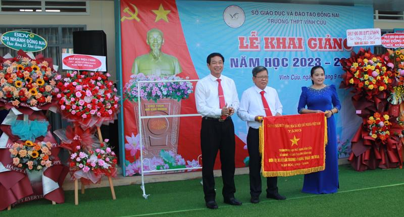 Dịp này, trường THPT Vĩnh Cửu vinh dự đón nhận cờ thi đua của Thủ tướng Chính phủ về thành tích hoàn thành xuất sắc toàn diện nhiệm vụ giáo dục đào tạo, dẫn đầu phong trào thi đua yêu nước năm học 2022-2023.