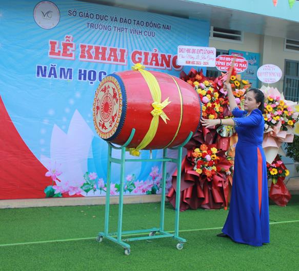 Hiệu trưởng trường THPT Vĩnh Cửu Bùi Thị Ngọc Nga đánh trống khai giảng năm học mới.