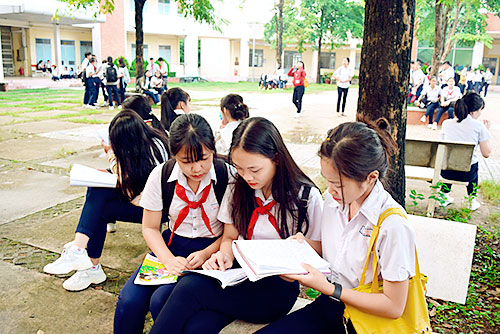 Thí sinh tại điểm thi Trường THPT Trấn Biên tranh thủ xem lại bài trước khi vào phòng thi.