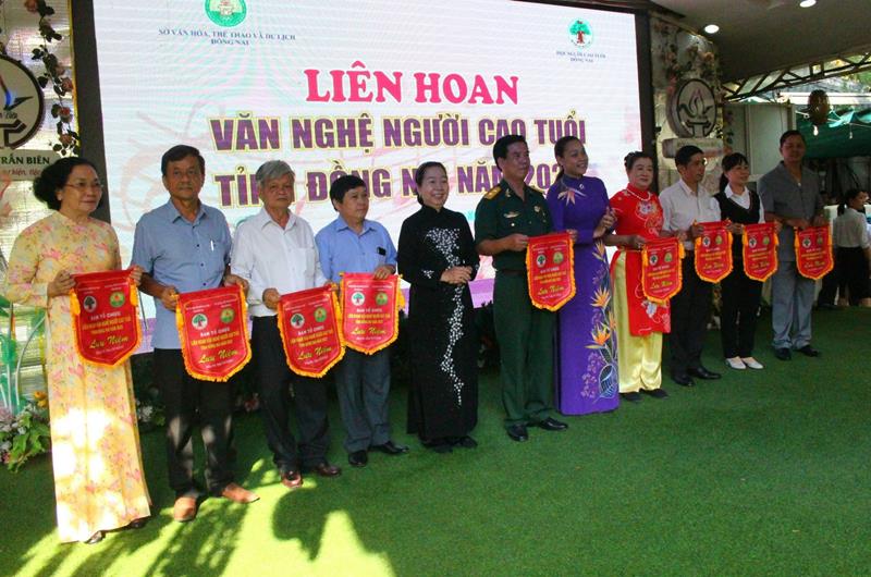 Ban tổ chức trao cờ lưu niệm cho các đơn vị tham gia Liên hoan văn nghệ Người cao tuổi tỉnh Đồng Nai năm 2022