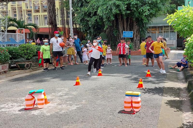 Các em thiếu nhi tham gia trò chơi vận động về phòng chống đuối nước tại lễ khai mạc hè 2022