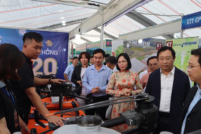 Tham quan gian hàng trưng bày các sản phẩm công nghệ cao Công ty CP Airnano Việt Nam, đơn vị đang phối hợp xây dựng các HTX ứng dụng công nghệ số ở Đồng Nai