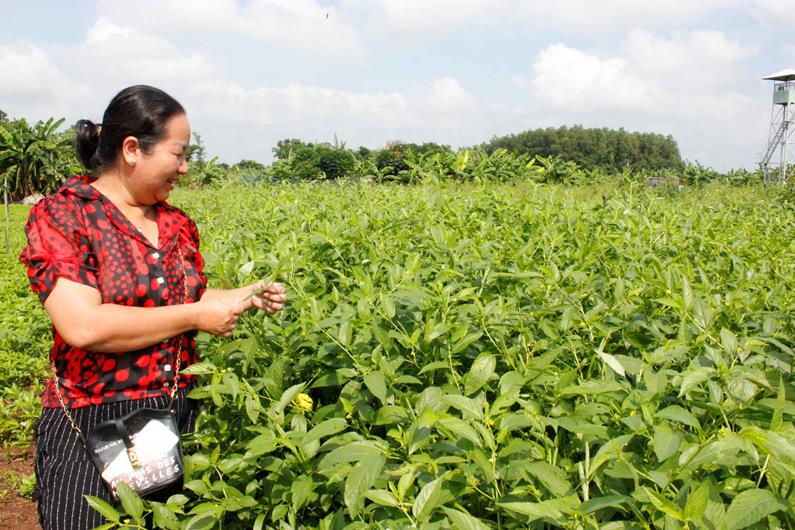 Bà An Tú Anh giới thiệu vùng trồng rau đay xuất khẩu của HTX Tân Yên tại xã Hưng Thịnh, H.Thống Nhất