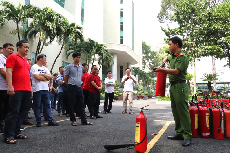 Cán bộ Phòng Cảnh sát PCCC & CNCH hướng dẫn sử dụng bình chữa cháy