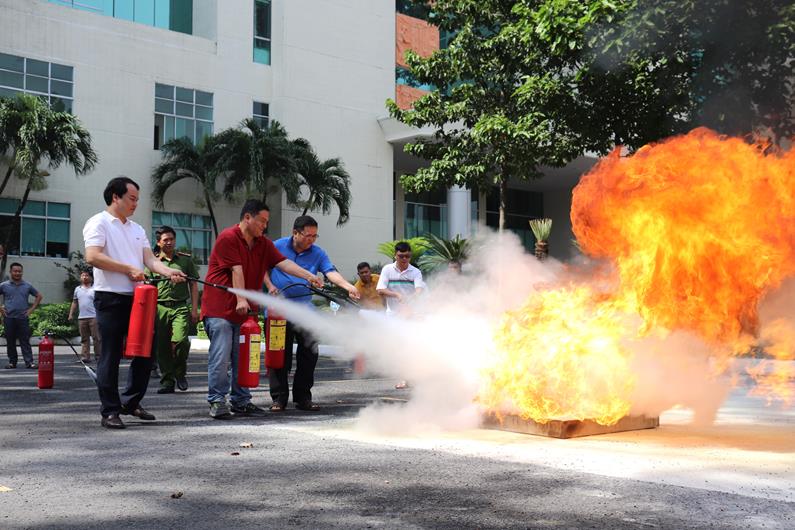 Các học viên thực hành kỹ năng sử dụng các loại bình chữa cháy