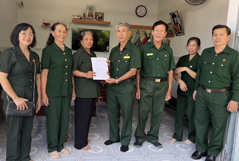 Đại diện Hội Cựu TNXP tỉnh, H.Trảng Bom và Chi hội cựu TNXP xã Đồi 61 trao quyết định hoàn thành sửa chữa nhà cho hội viên Nguyễn Thị Lài