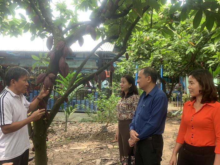 Ông Phạm Tấn Linh, Phó Trưởng Ban Tuyên giáo Tỉnh ủy- Phó Trưởng Ban Chỉ đạo Ban vận động 264 (áo xanh) thăm Hợp tác xã ca cao Suối Cát, H.Xuân Lộc