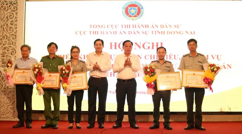 Phó Tổng Cục trưởng Tổng Cục THADS Nguyễn Văn Sơn và Quyền Chủ tịch UBND tỉnh Võ Tấn Đức trao bằng khen của Bộ trưởng Bộ Tư pháp cho tập thể, cá nhân có nhiều đóng góp tích cực trong công tác phối hợp cũng như hoàn thành xuất sắc nhiệm vụ được giao