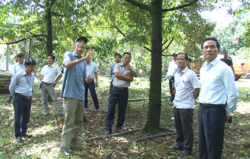 Tại buổi khảo sát, Phó Chủ tịch UBND tỉnh đã tham quan mô hình trồng cây sầu riêng sạch áp dụng công nghệ cao phát triển bền vững hướng đến sản xuất chuyên sâu, bảo quản và xuất khẩu của Công ty Ðông Nam. Hiện công ty này đã trồng hơn 50 ha sầu riêng bước đầu cho hiệu quả khi cây sinh trưởng tốt, một số ít diện tích đã cho thu hoạch.