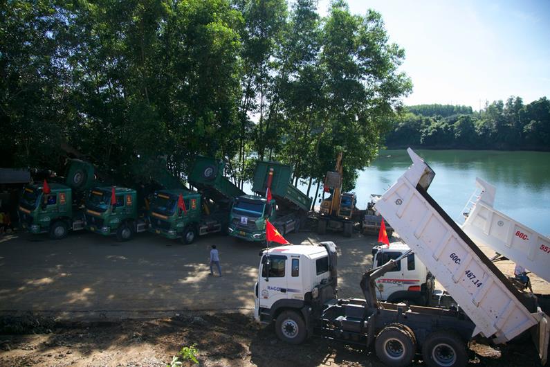 Các phương tiện thi công cđược tập kết để xây dựng cầu